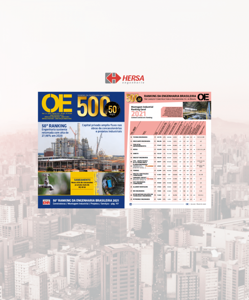 A Hersa Engenharia figurou novamente no Ranking da revista O EMPREITEIRO – 500 Grandes da Construção, edição de Julho-Agosto/2021. A presença no Ranking Nacional de Montagem Industrial e Construção Mecânica e Elétrica consolida a empresa como uma das maiores do Brasil no segmento em que atua. O Ranking 2021 pode ser encontrado no site https://revistaoe.com.